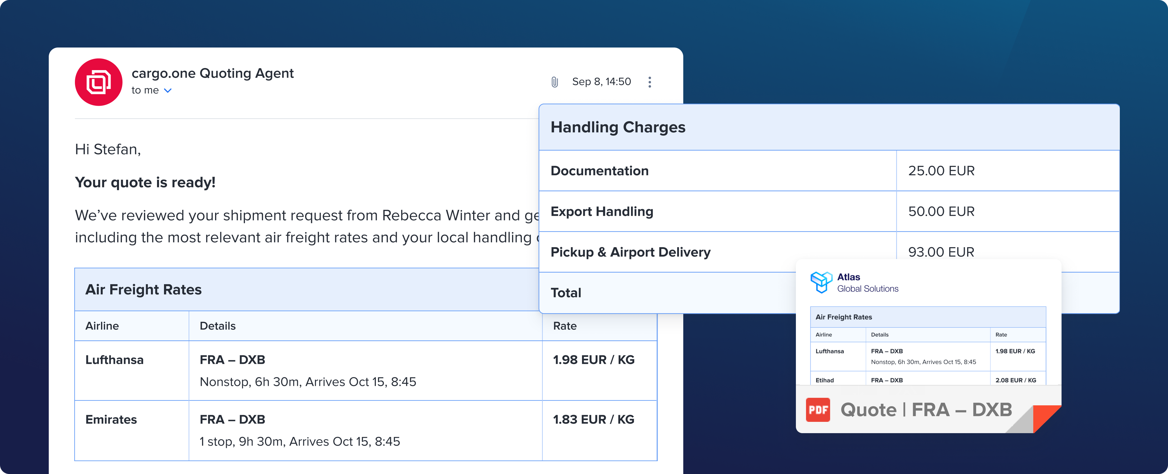 This is only possible because the AI is built on cargo.one's comprehensive, high-quality rate data and learns from each freight forwarder's preferences. As Christopher explains, "cargo.one's AI quotes are spot-on—we rarely need to make changes, saving significant time while maintaining control over customer communication." This level of control matters: forwarders review every quote before it goes to the customer. They can edit, adjust, or completely rewrite before sending, or send as-is. The forwarder always makes the final decision.